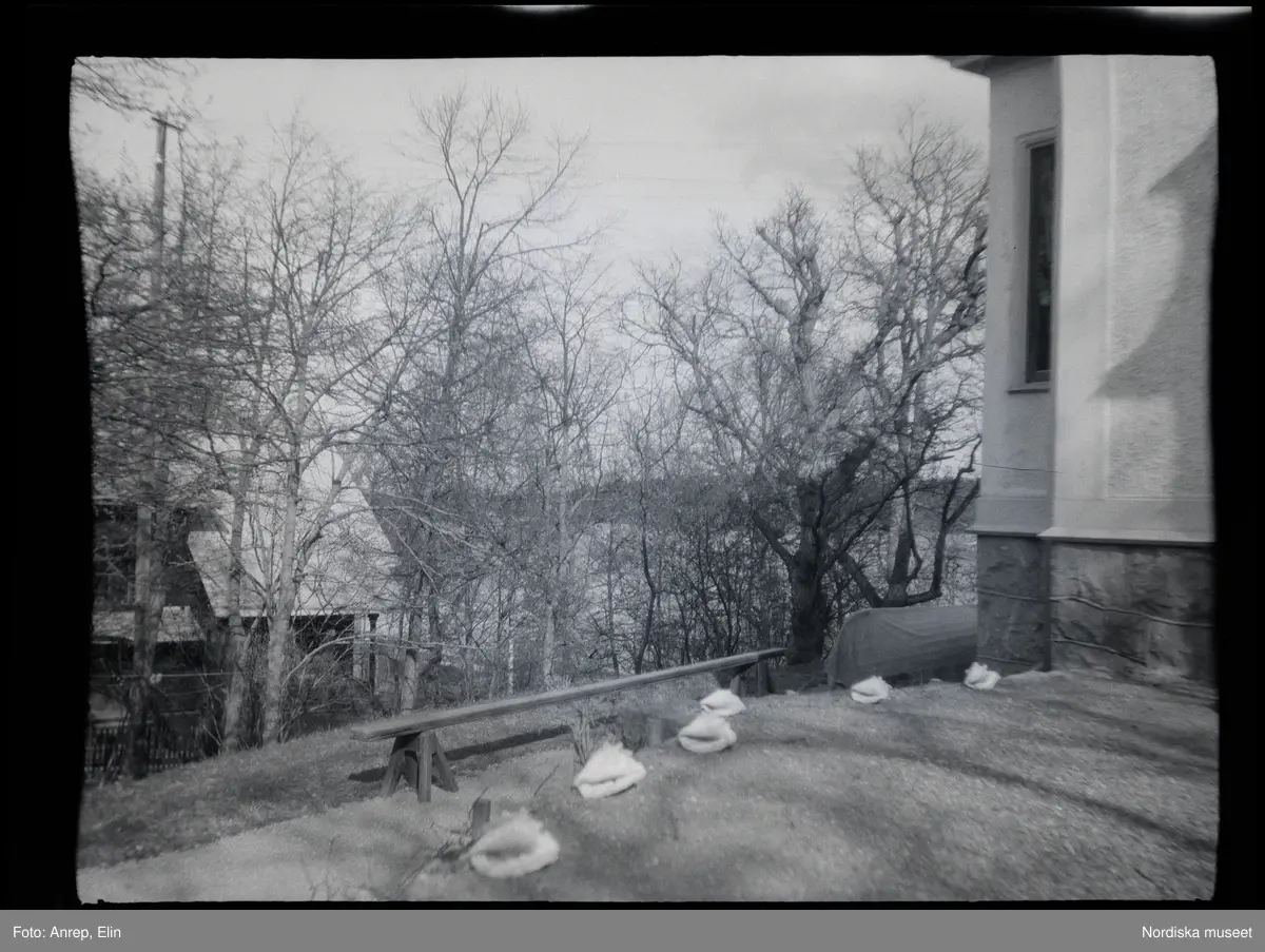 Vy över på tomten till familjen Morthensens villa Solveden, Djursholm. Stora snäckskal ligger i rad framför huset.