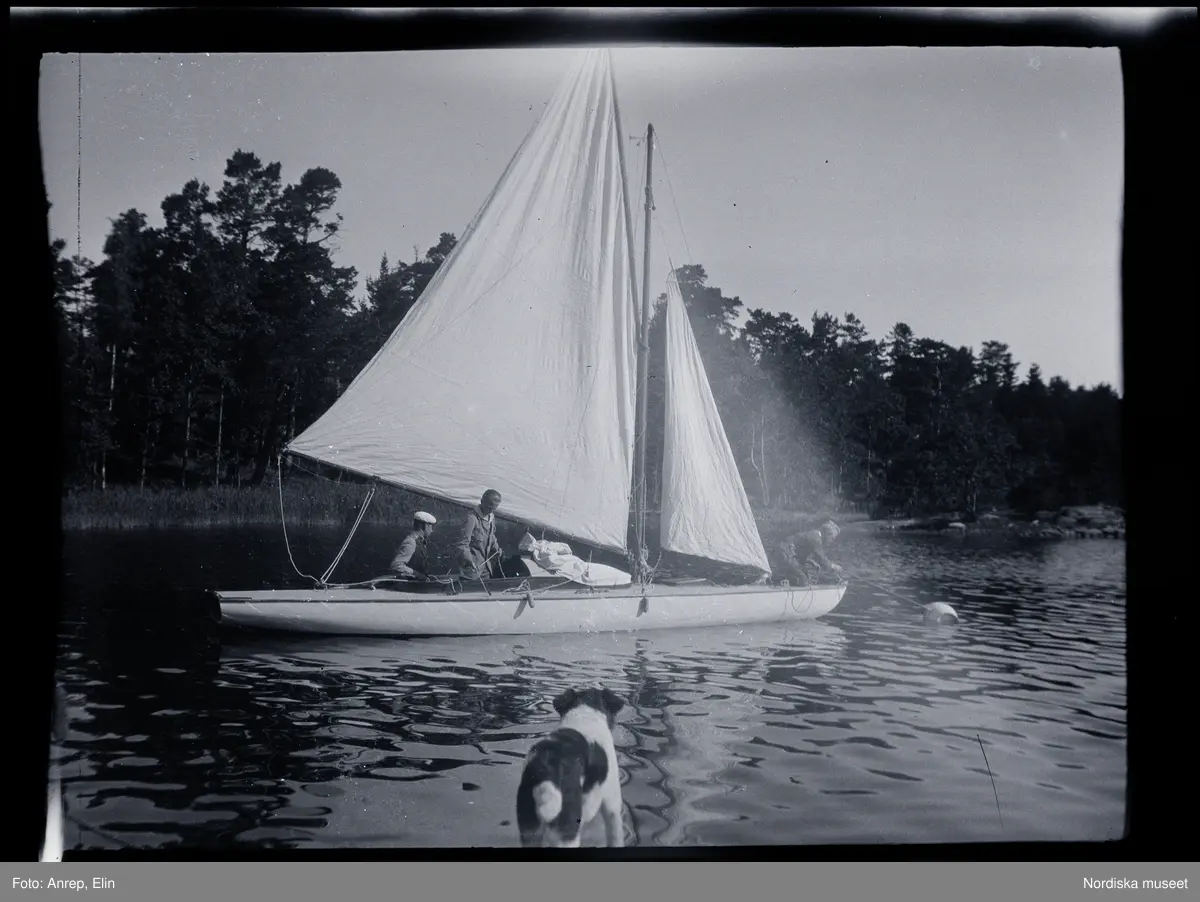 Tre unga män i en segelbåt.