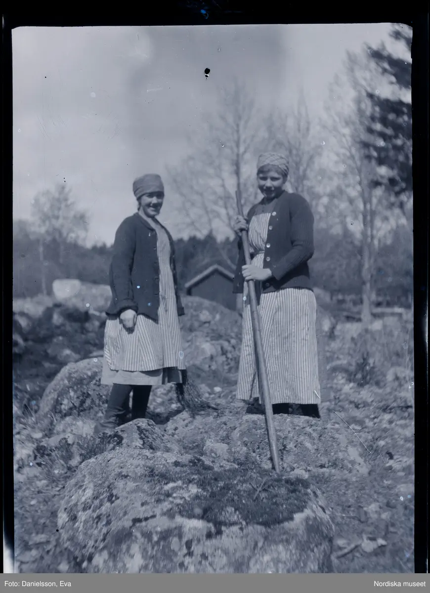 Två kvinnor arbetar utomhus bland stenar med spett och borste.