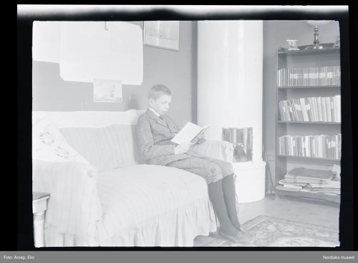 Pojke sitter och läser i en soffa intill en kakelugn.