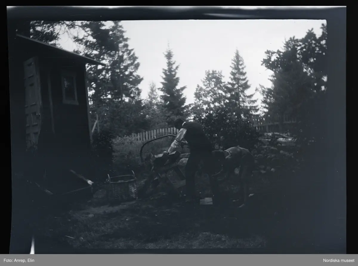 En man sågar ett trästycke och en pojke hugger med en yxa, på gården vid en stuga.