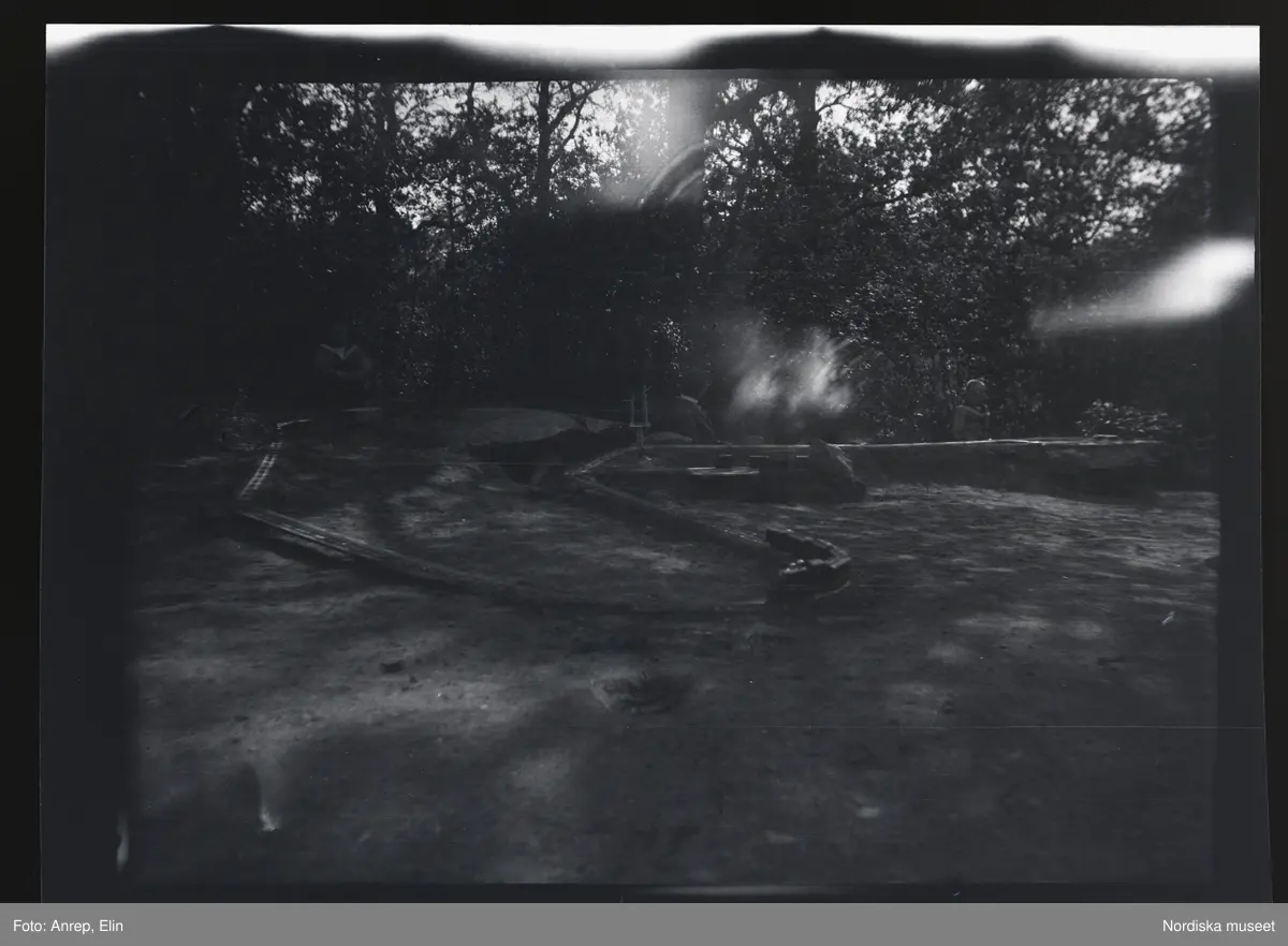 Barnen leker med en modelljärnväg i trädgården till familjen Morthensens villa Solveden, Djursholm.