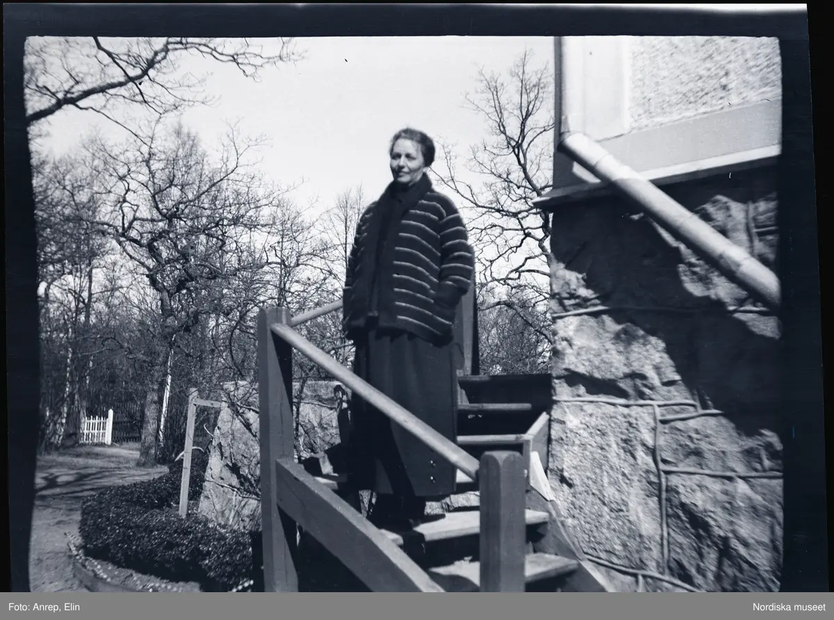 En kvinna porträtterad ståendes i en trappa till familjen Morthensens villa Solveden, Djursholm.