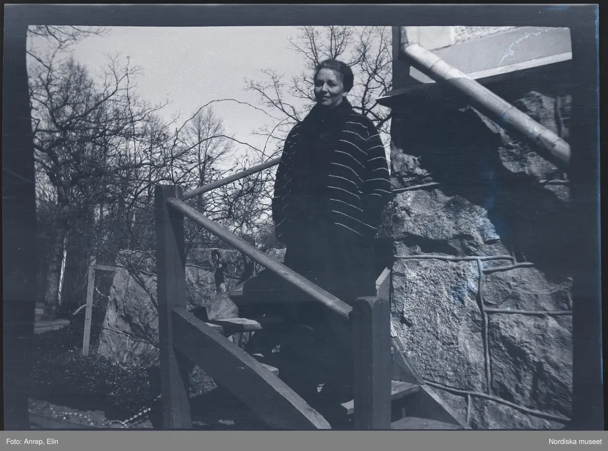 Titel: En kvinna porträtterad ståendes i en trappa till familjen Morthensens villa Solveden, Djursholm.