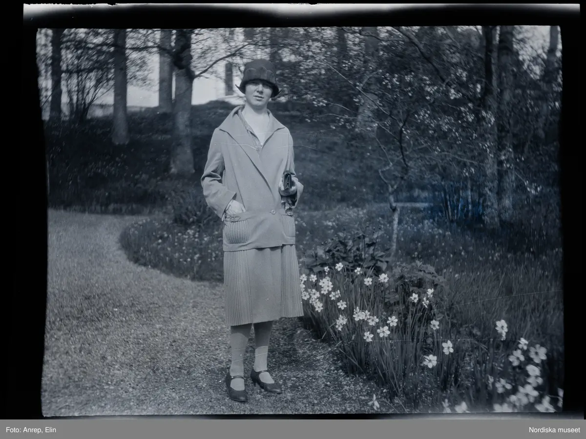 Kvinna porträtterad intill en rabatt med blommande narcisser i trädgården till familjen Morthensens villa Solveden, Djursholm.