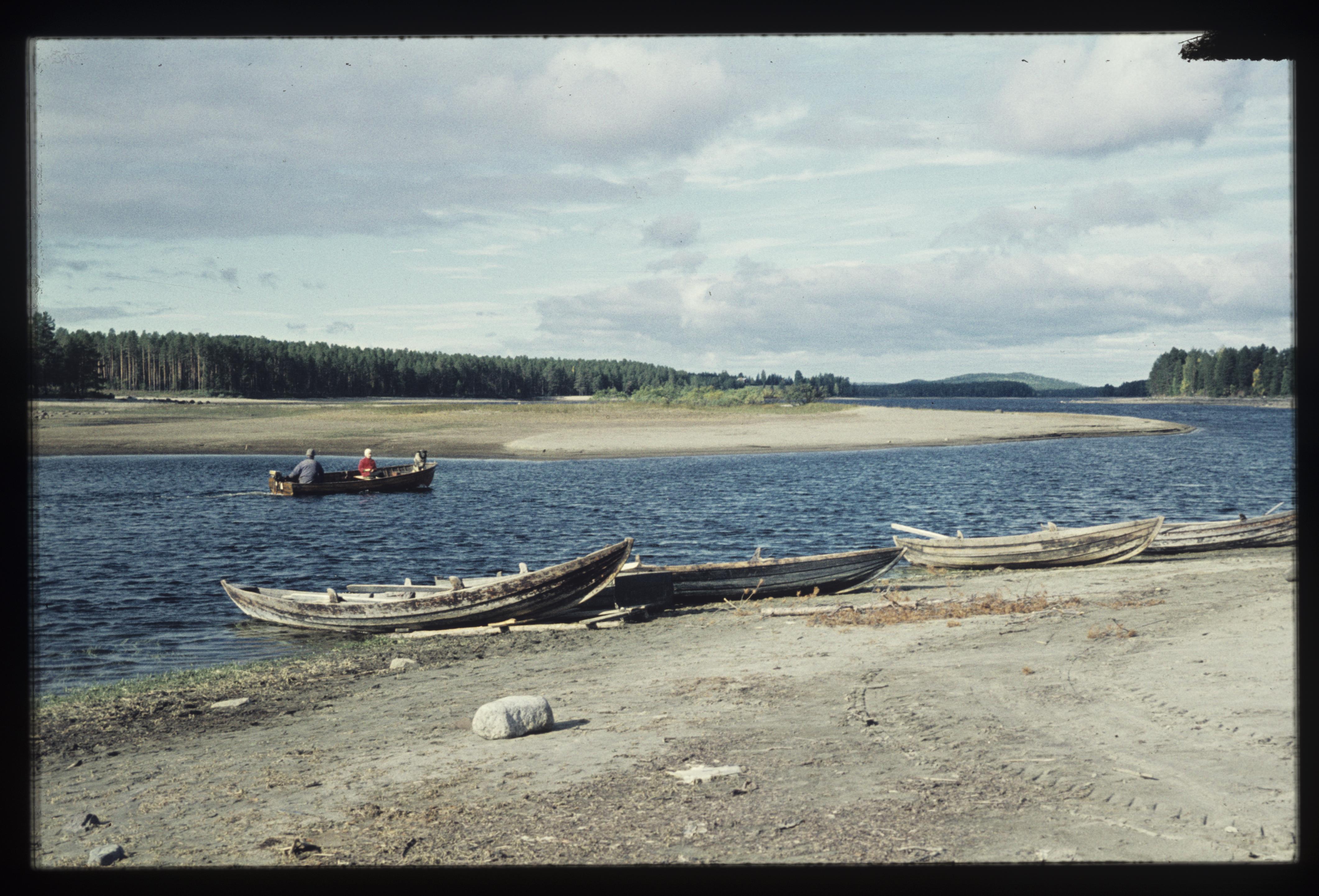 Umeälven vid Åtskiljebys badplats, ovanför Rusfors kraftstation. Uppdragna båtar.