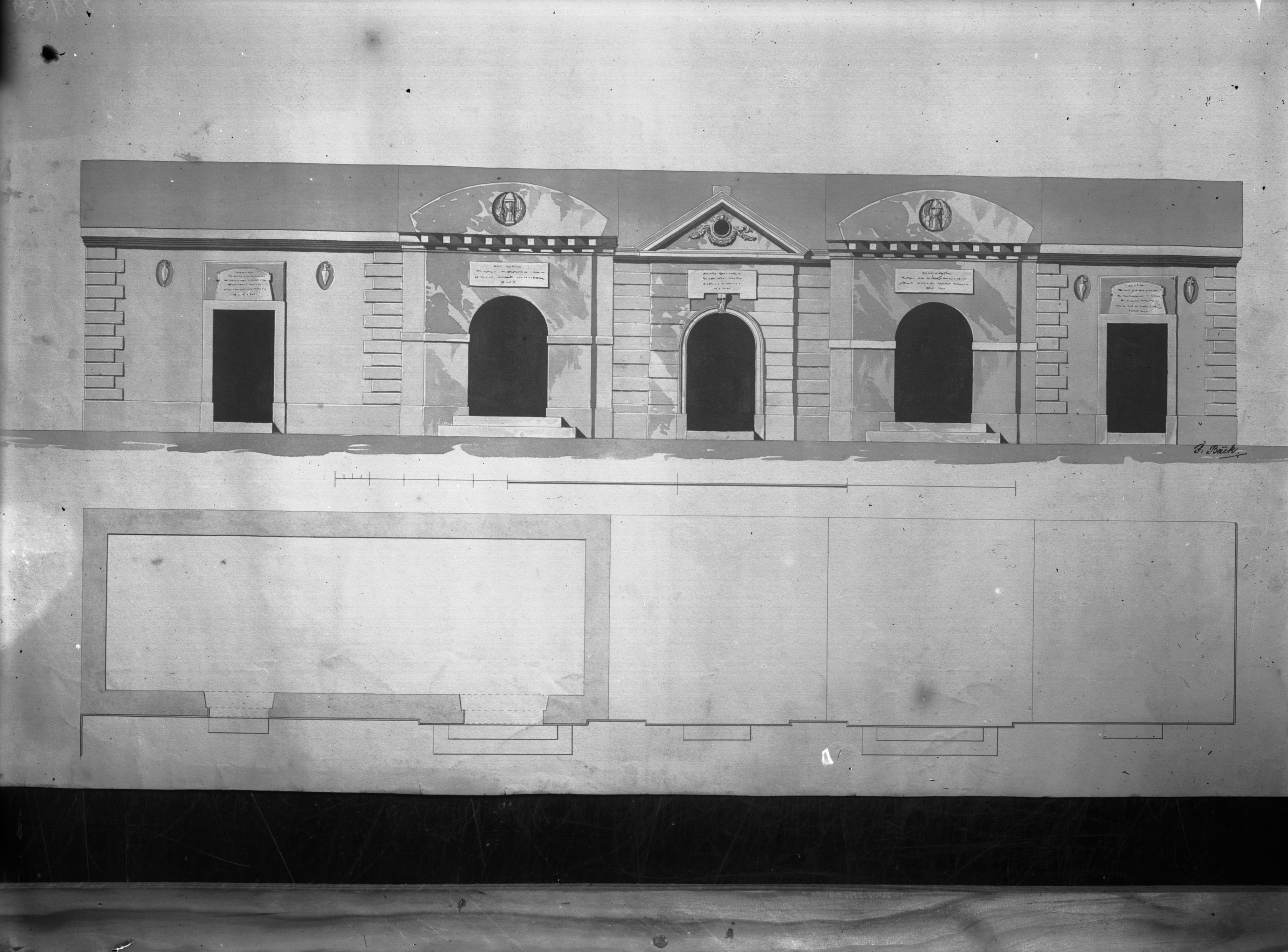Förslag till ihopbyggnad av gravkor. Foto efter fasad- och planritning av F. M. Bäck 1830, ur Jakobs kyrkoarkiv.
