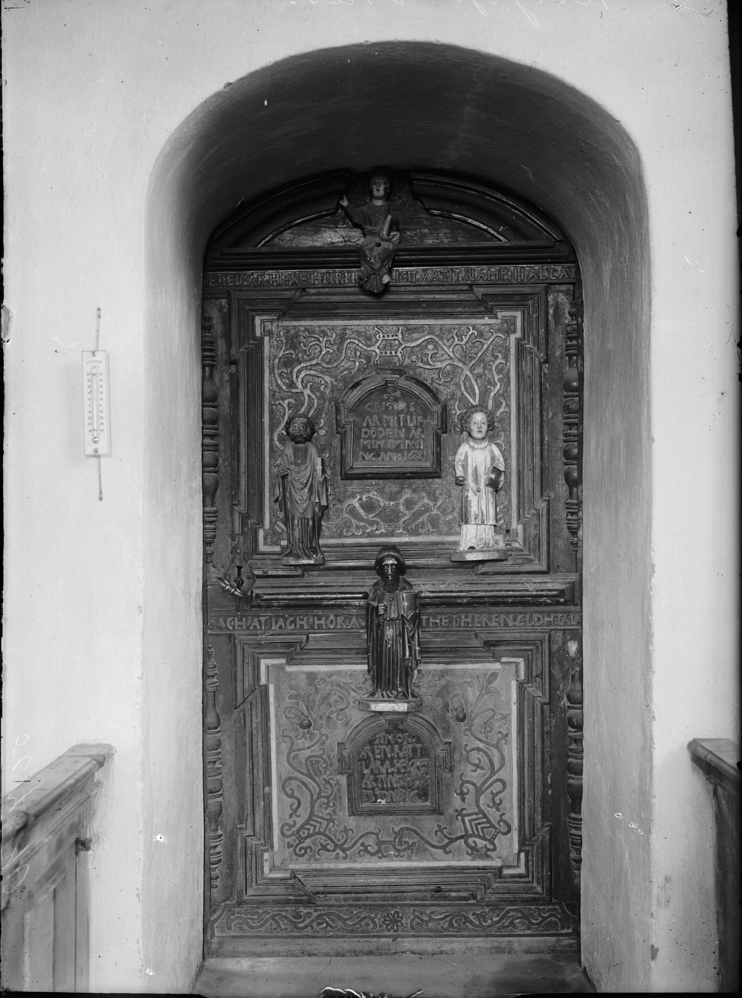 Dörr, skulpterad med plattskärning, fyra bilder av medelida skulptur, 1688.