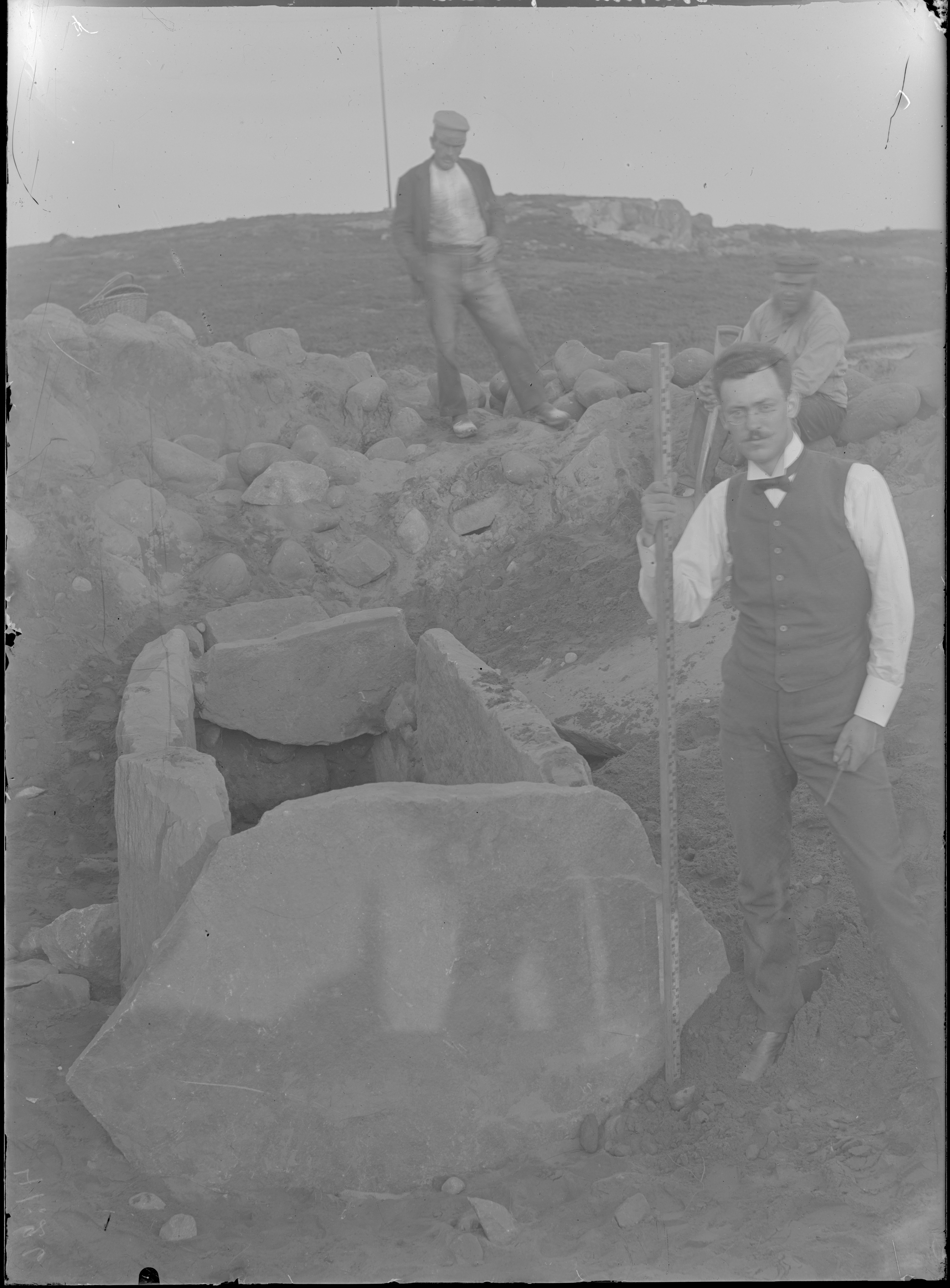 RAÄ-nummer Söndrum 18:2. Spritkullen. Män vid hällkista utgrävd ur hög vid Söndrums stenbrott. Undersökning av Ture J. Arne 1905.