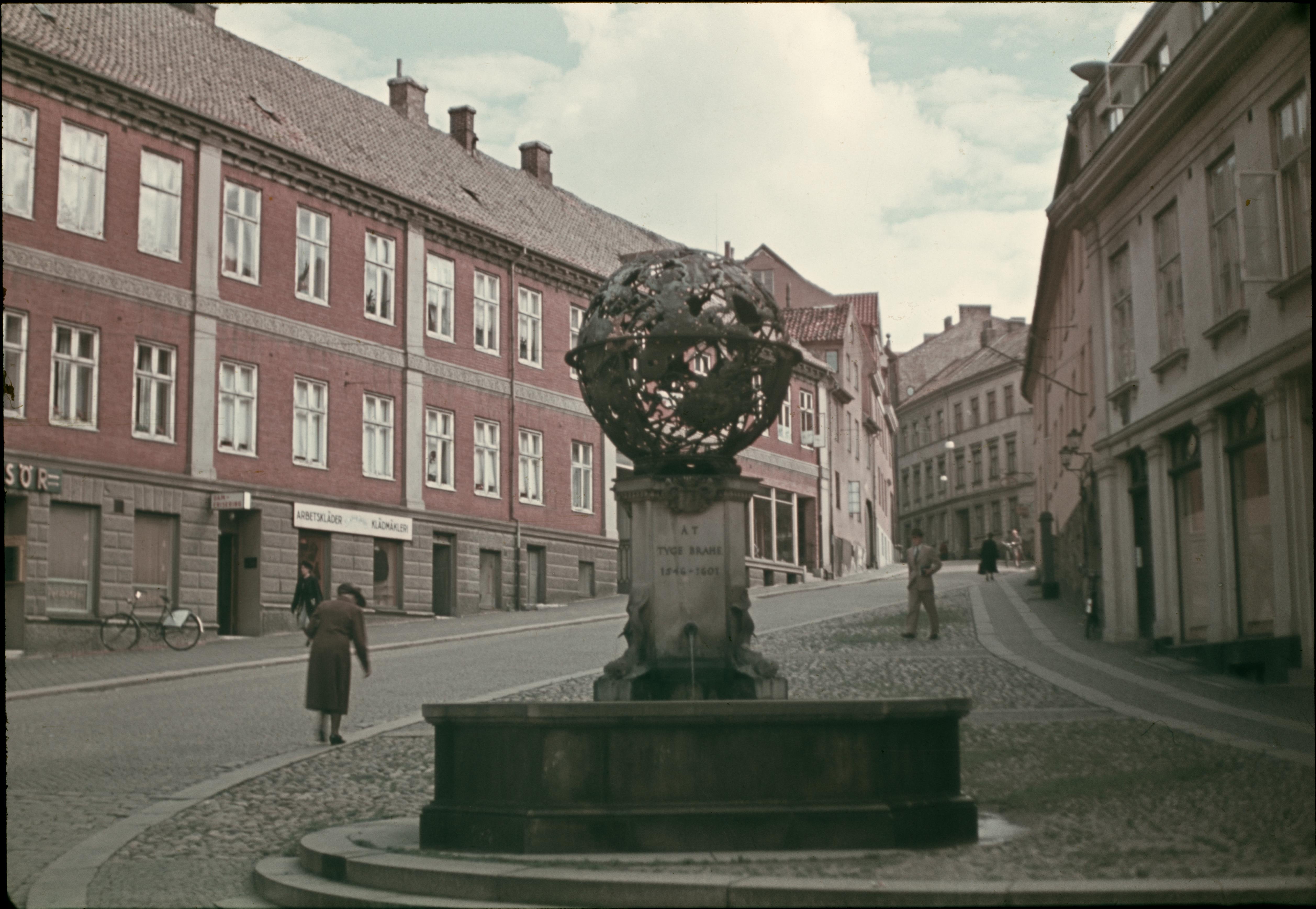 Korsningen Nedre Långvinkelsgatan och Norra Storgatan. Tycho Brahebrunnen av Astrid Aagesen och Gustaf Widmark.