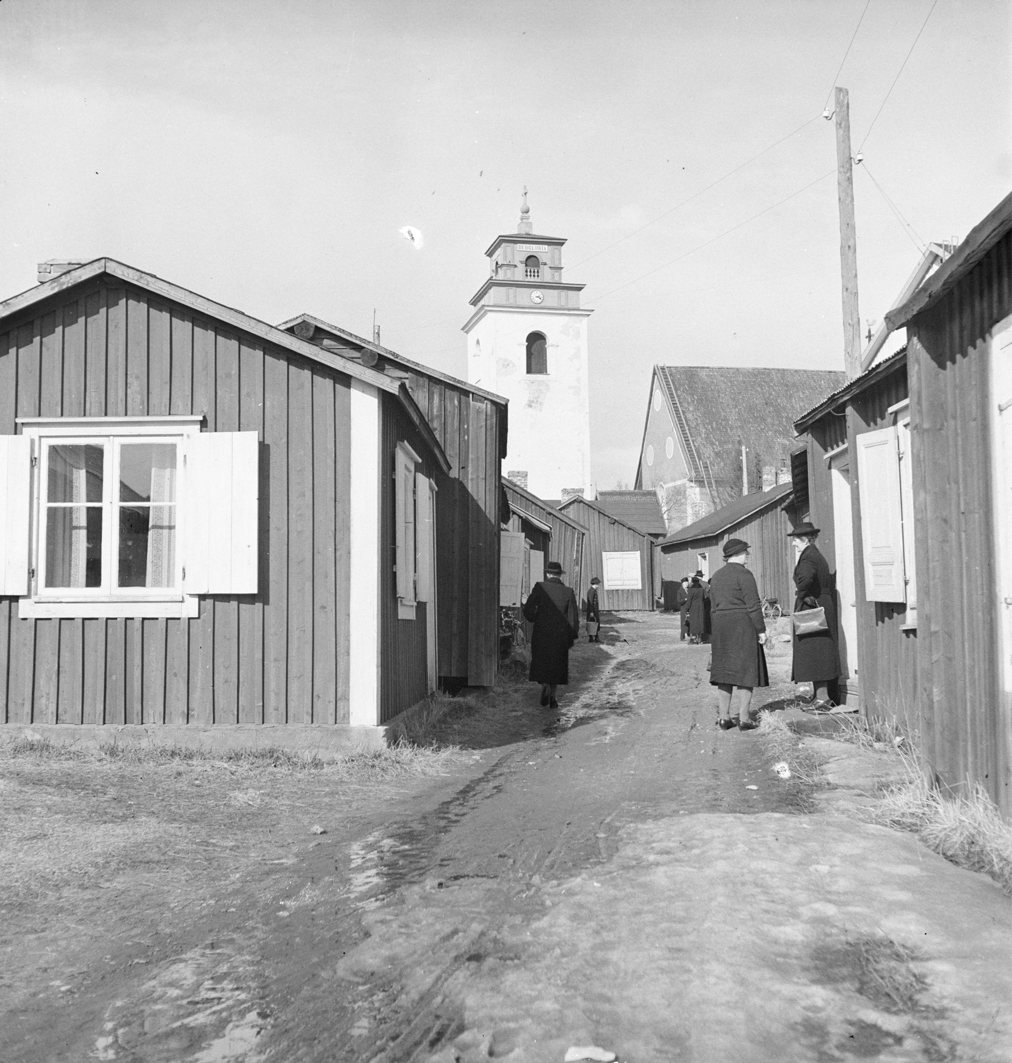 Kyrkstugor med Nederluleå kyrka i bakgrunden. Bilden tagen på 1940-talet.