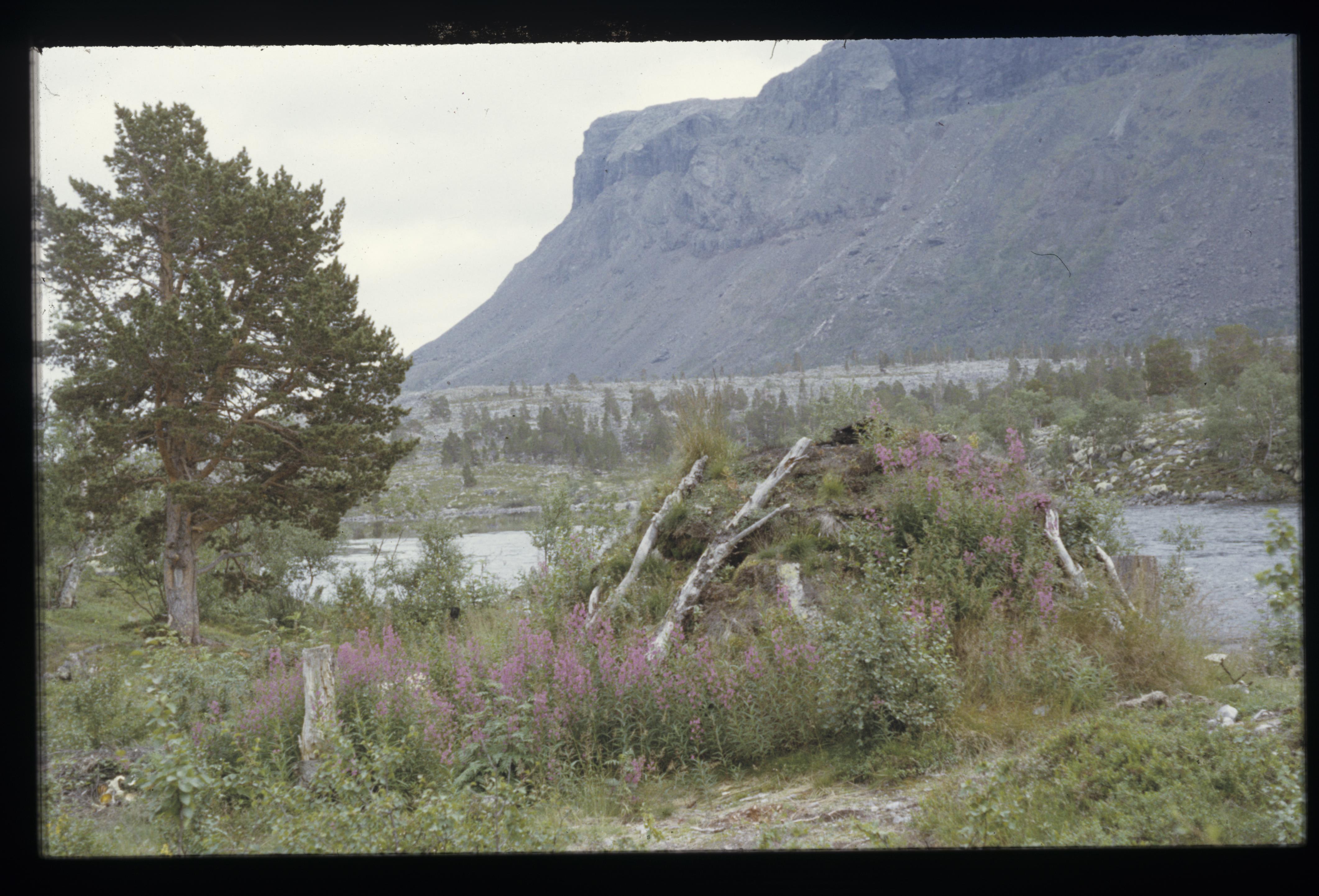 Kåta täckt av torv i förgrunden. Vid sjön. Laponia.