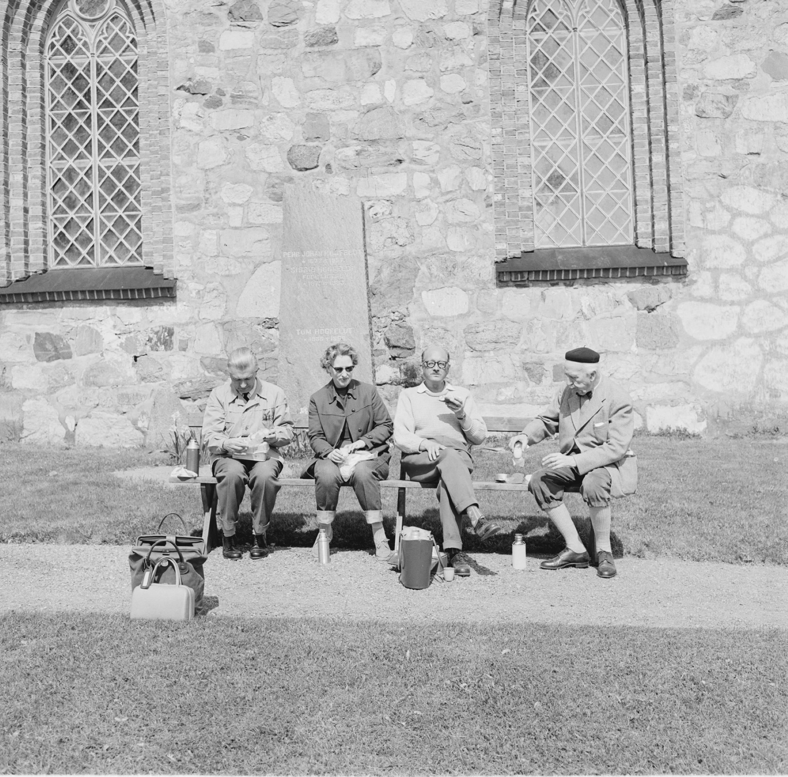 Kyrkans sydfasad. Sveriges Kyrkors utgivare, med medarbetare, poserar under en fikapaus.