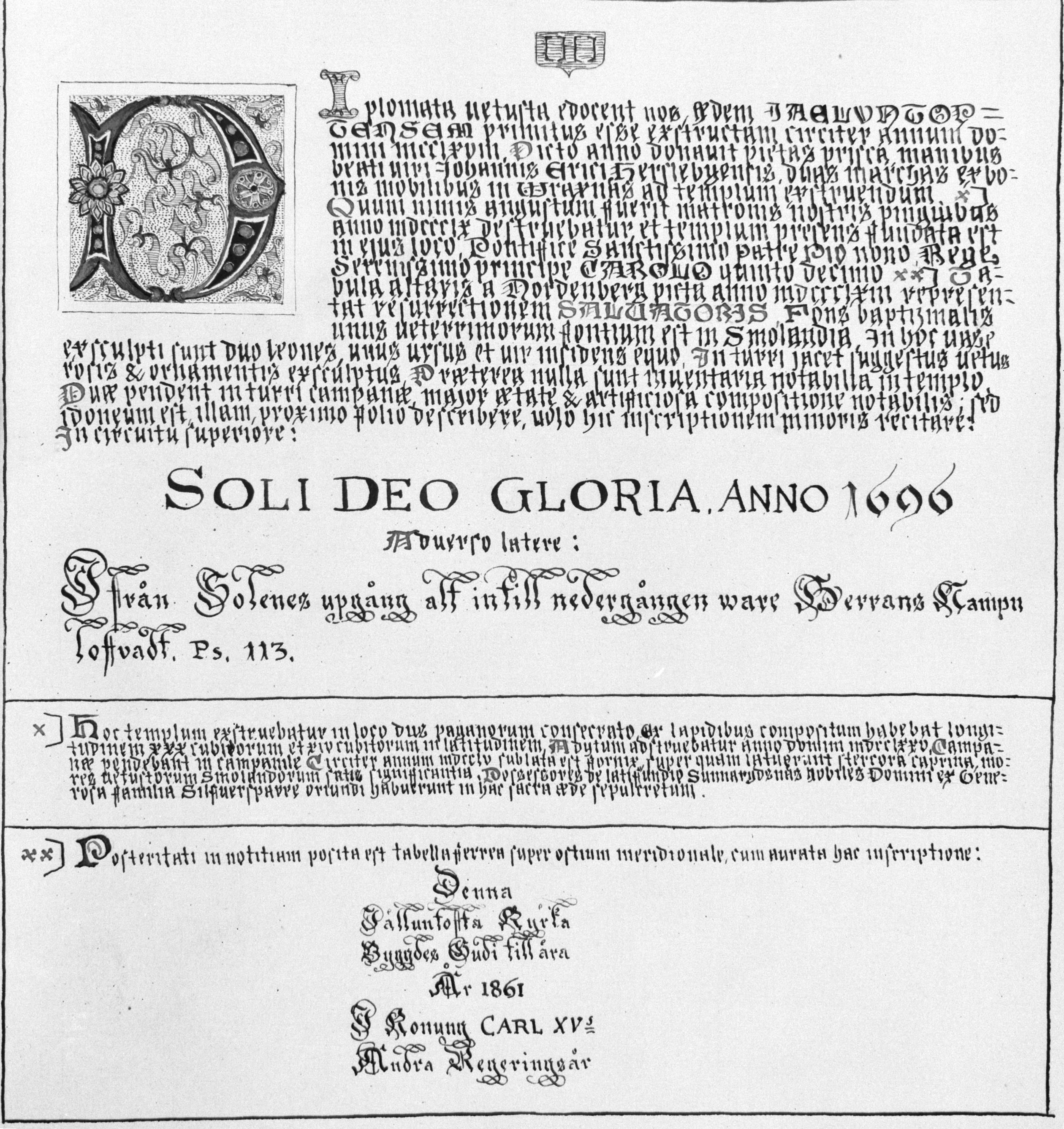 Diplom om kyrkans uppförande år 1861, avfotograferat ur Ihrfors: Smolandia Sacra, s 310.