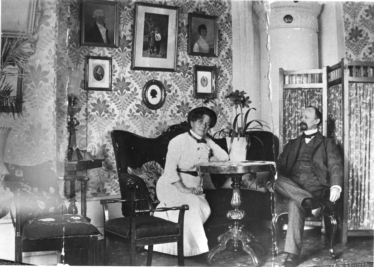 Bokhållare Lincoln Unge med fru, även kallad "Vackra Hanna" och "Vackra fru Berg". Fotot taget i makarnas hem i Kungsgården. De bodde bland annat på övre våningen i stationshuset, varifrån fotot eventuellt kan vara hämtat. Årtal okänt. Rosenlöfs tryckeri.