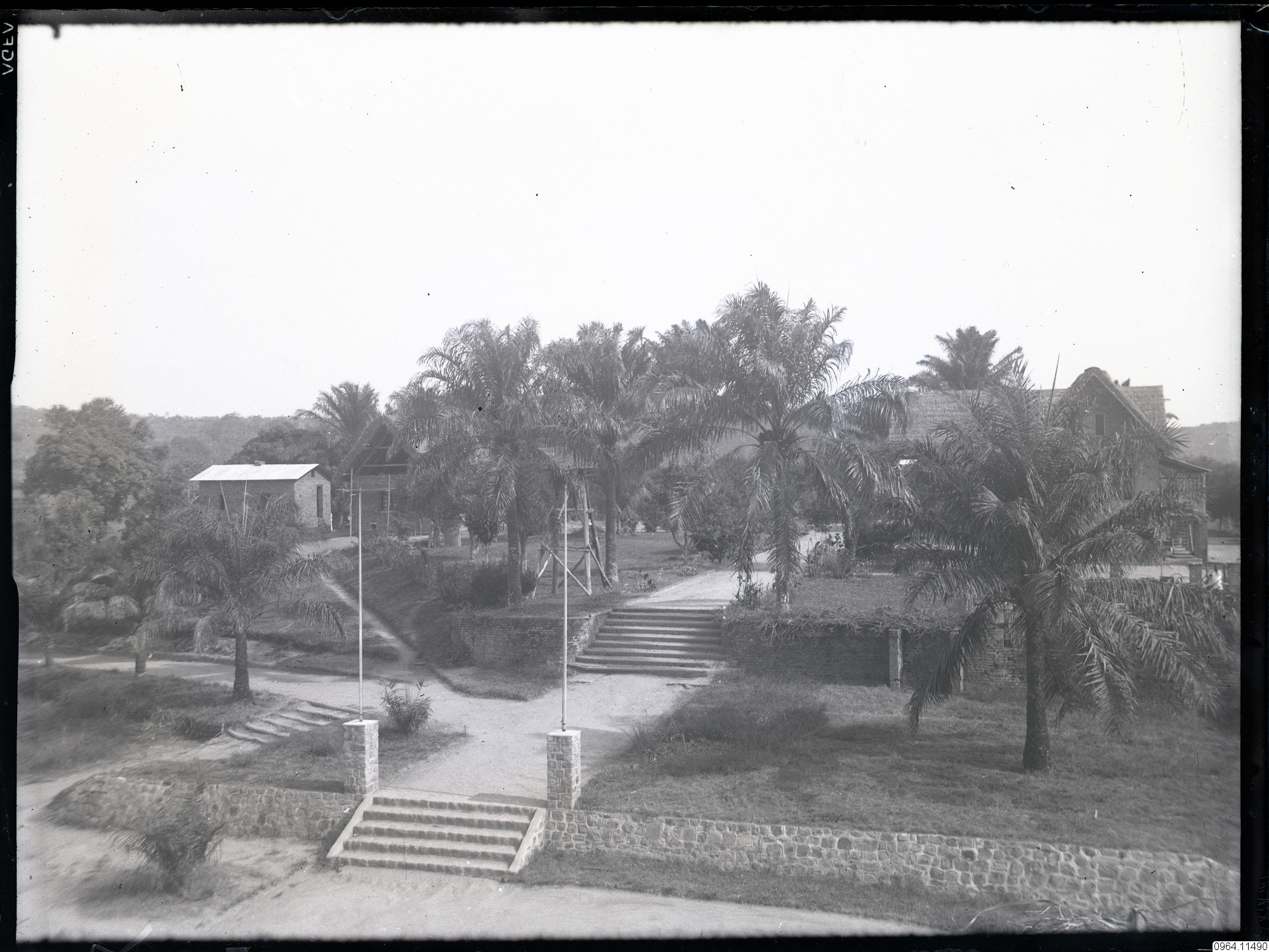 Missionsstationen Musana. En klockstapel och flera hus syns samt flera trappor. Jämför bild 0964.d.2299.