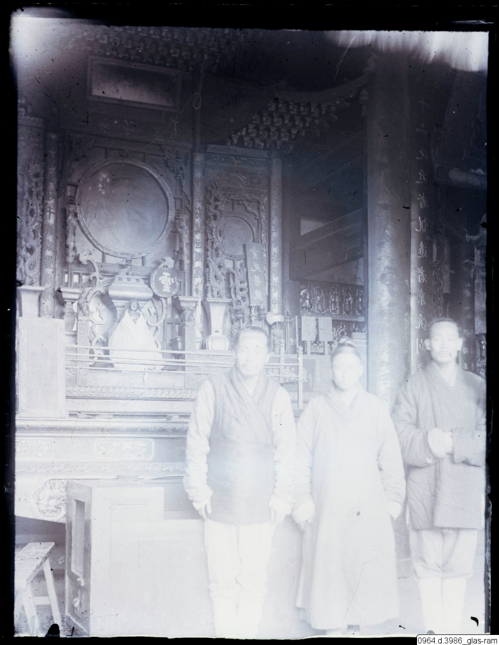 Tre män i traditionella kinesiska kläder framför snidad vägg och föremål, tempel?