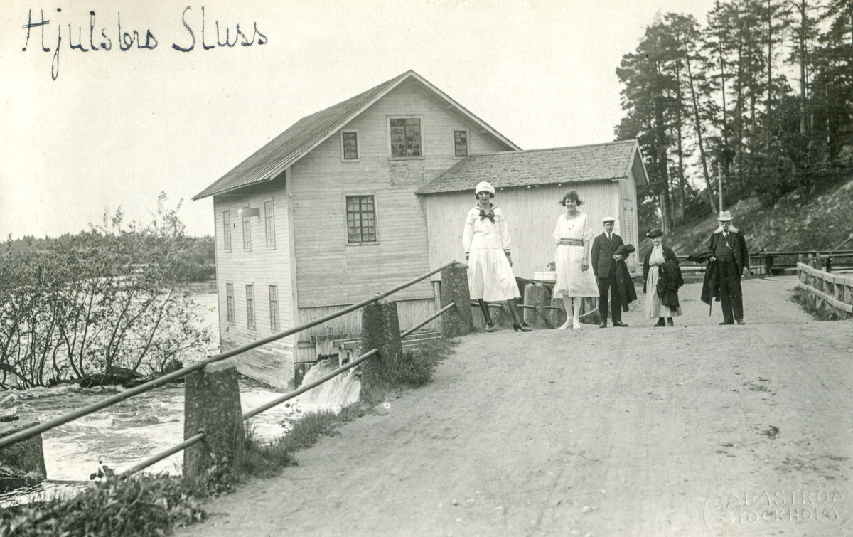 Delar av familjen Karlén och Malmström på promenad på landvägen vid Hjulsbro. I bakgrunden syns en kvarn i Stångån.