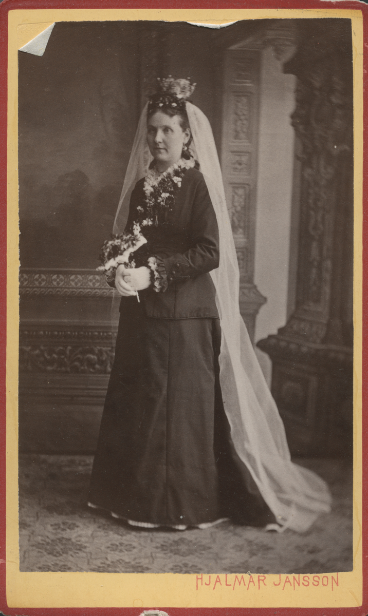 Titel: Bröllopsporträtt av Fru Karin Bäcklin född Altberg, år 1882, 28 maj. till Tekla Svedlund (enligt text baksida kort).