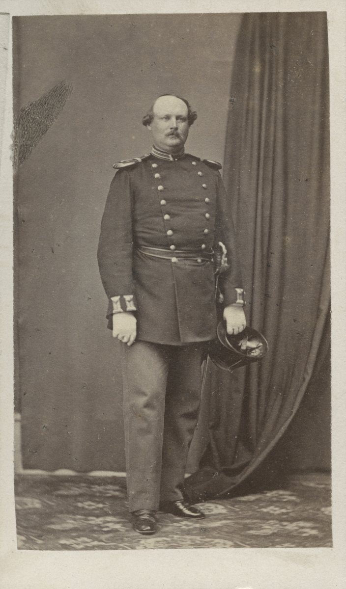 Mansporträtt. Text baksida kort:" Grefve Carl Ernst Christer Horn. Löjtnant vid kongl. norra Skånska Inf. Reg. kompanichef vid kongl. krigsakademin, år 1865".