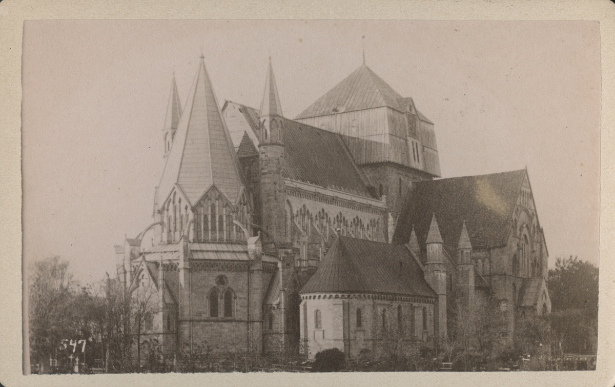 Trondheims Domkyrka. Texten på baksida kort är ett meddelande om en försäljning som görs till förmån för restaureringen av kyrkan d. 6 aug. -91.
