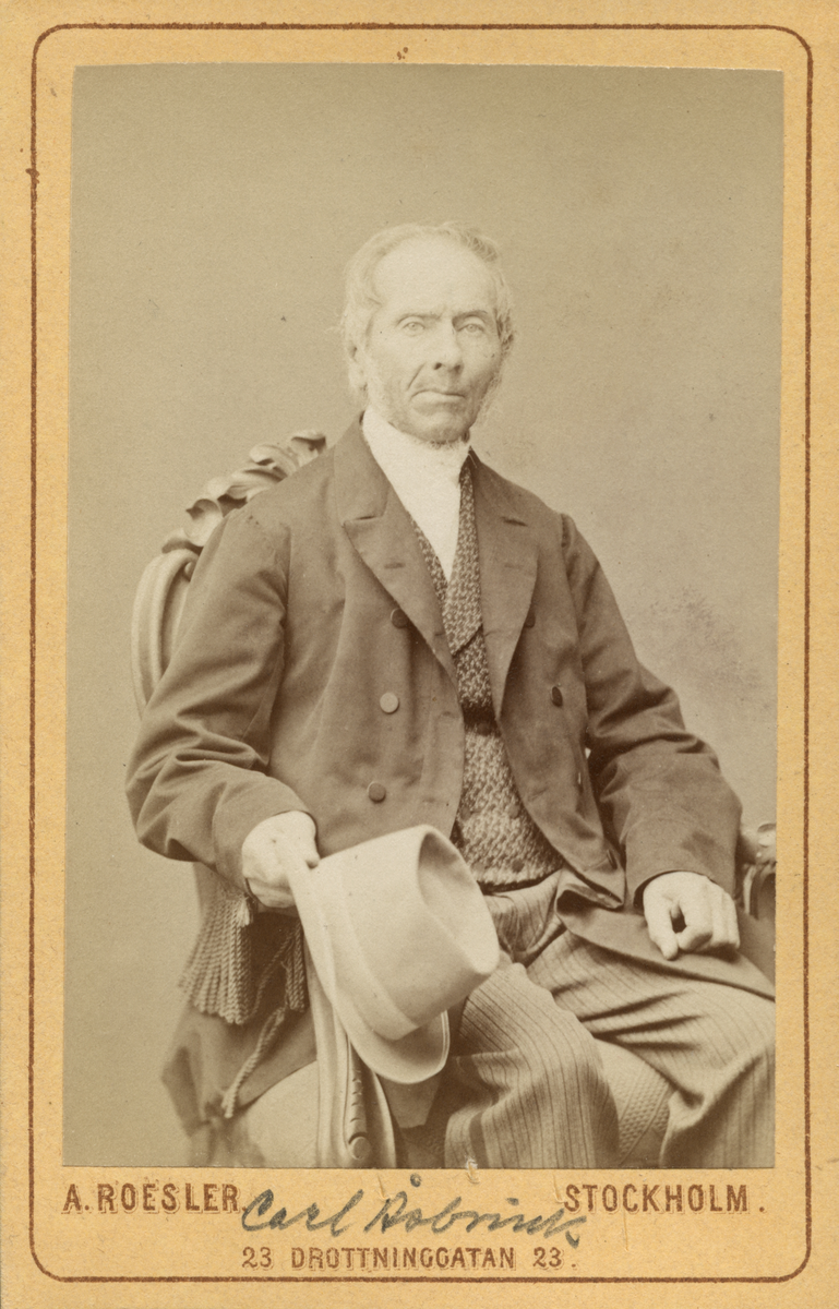 Porträtt av Carl Åsbrink. Text baksida kort: "aftaget vid 77 års ålder".