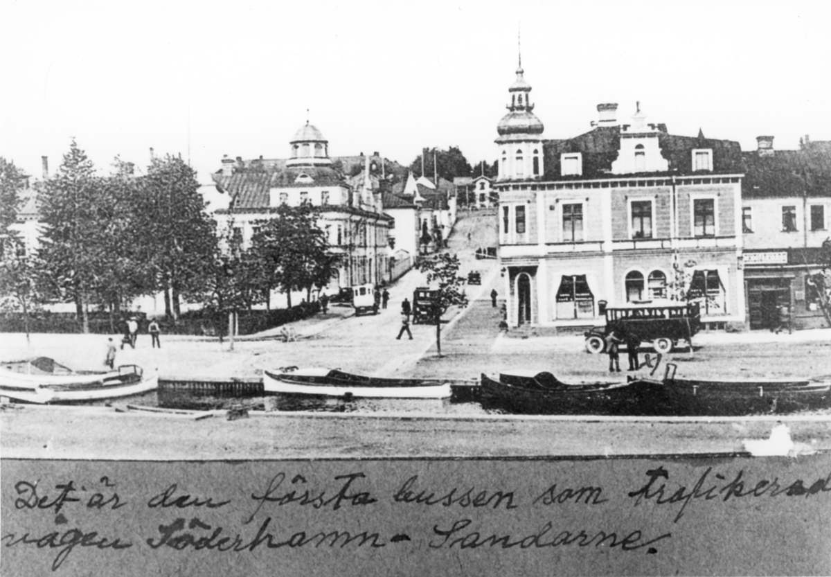 Skolhusgatan med omnibussarnas hållplats markerad på norra Hamngatan i Söderhamn. Foto i början av 1920-talet.