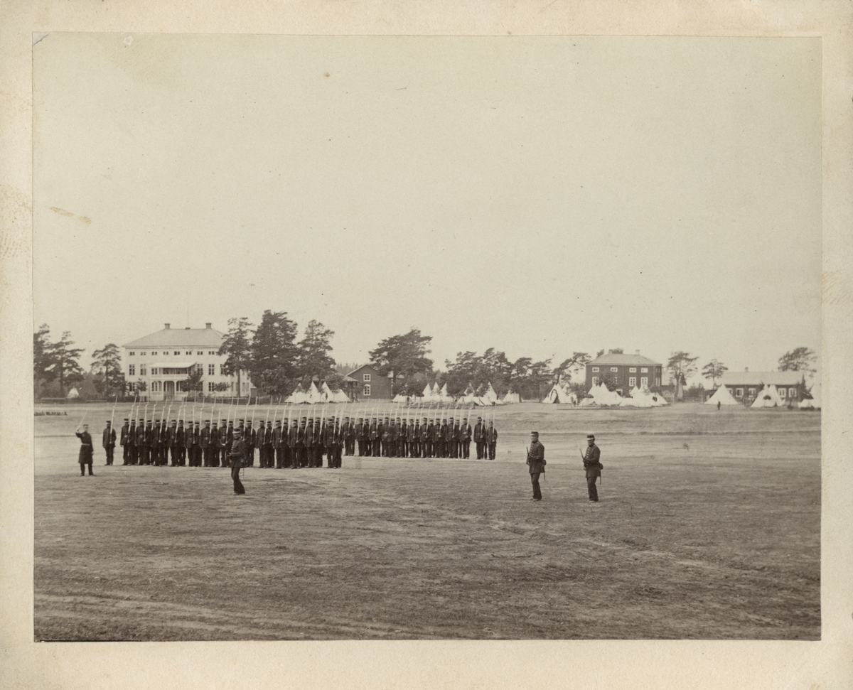 Militära övningar som utförs vid Mohed, Söderhamn, Hälsinge regemente I14, med officersmässen i bakgrunden.