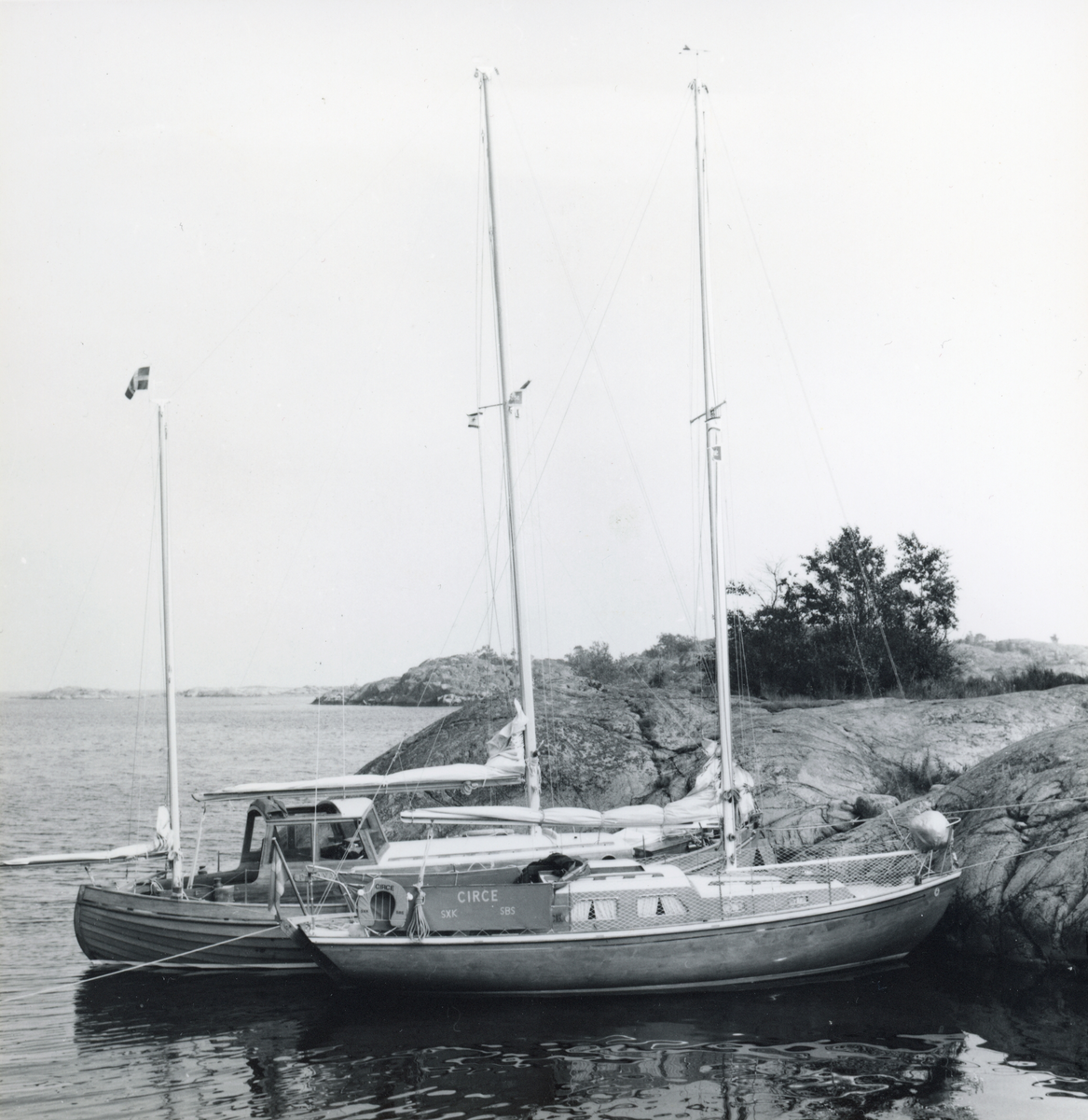 Motorseglaren PIRAYA och en segelbåt ligger förtöjda vid klippa i skärgårdsmiljö. Vattnet är lugnt och klippor med gles vegetation syns i bakgrunden.