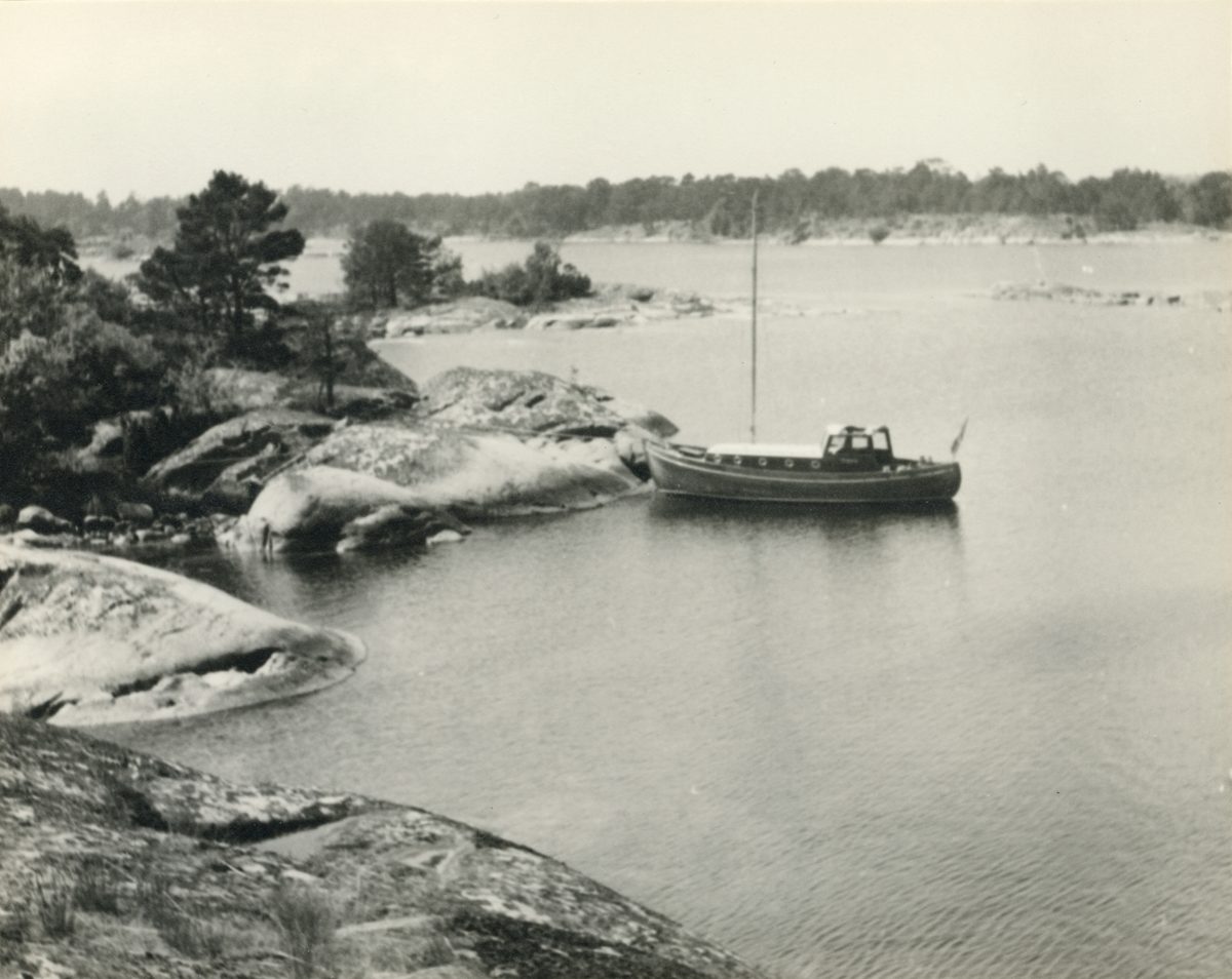 Motorseglaren PIRAYA ligger förtöjd vid en klippa i skärgården 1958.