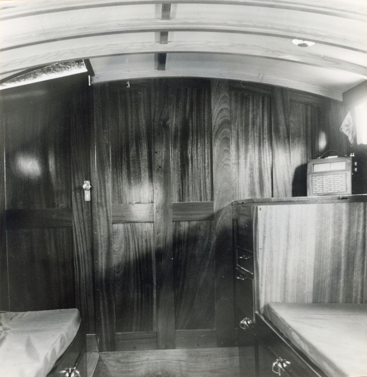 Interiörbild från motorseglaren PIRAYA. Vy över köket och radio.