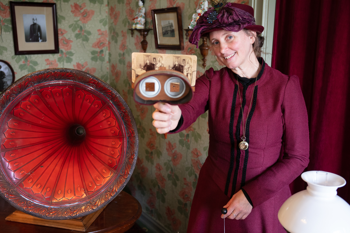 Titel: Vänersborgs museum. Museipedagog Greta Åberg har dukat upp bord med föremål inför skolvisning