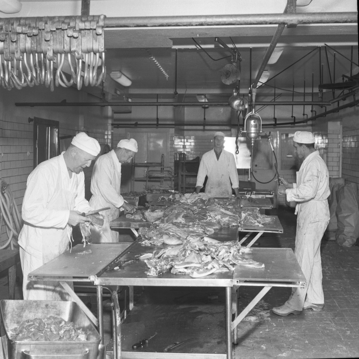 Flera män runt bord fyllda med köttstycken. Bilden är från kronochakturiet på Stumholmen.