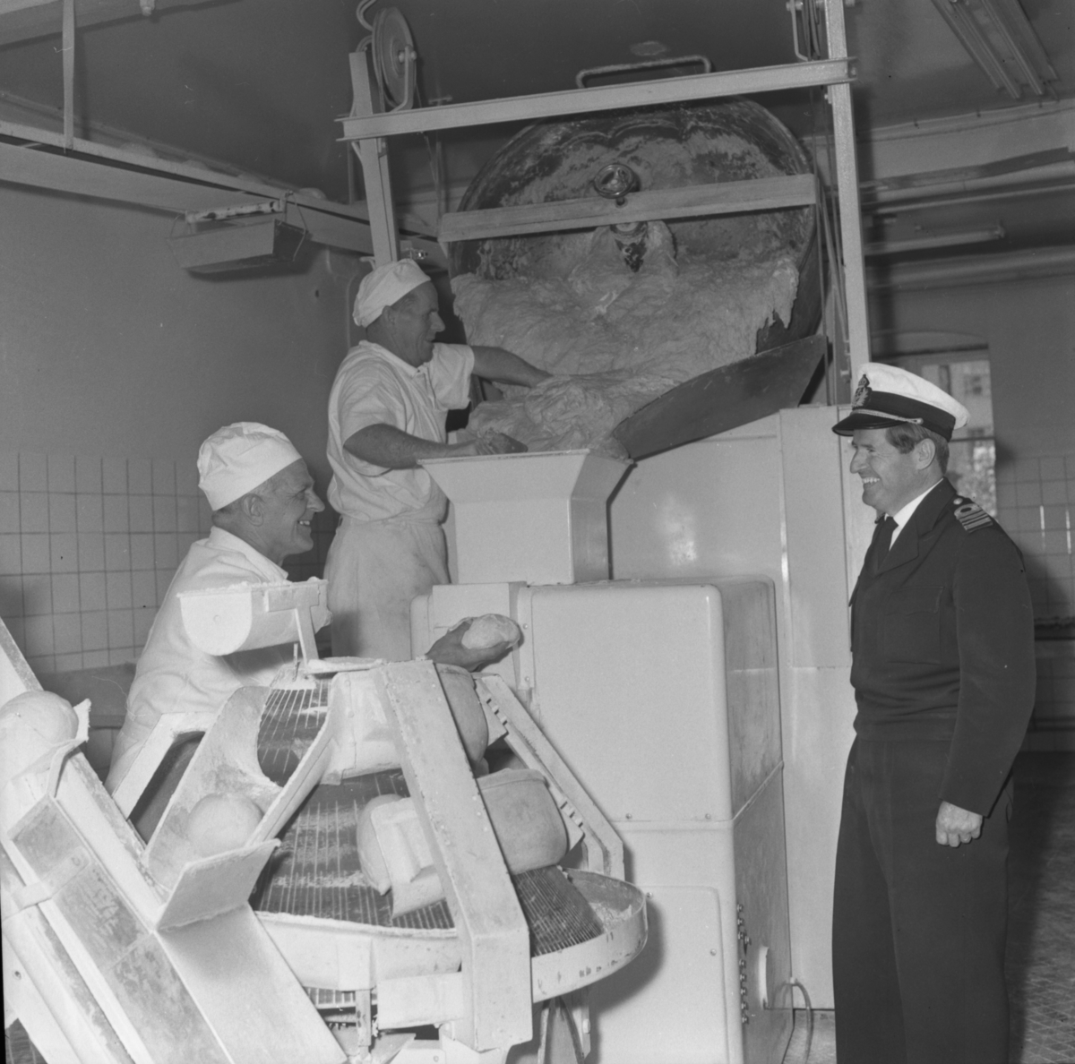 Två bagare vid ett stort tråg fyllt med deg, som lyfts upp och tippas. Ena bagaren föser ner degen och den andra håller i en degklump. En man i uniform står vid sidan av. Bilden är från kronobageriet på Stumholmen.