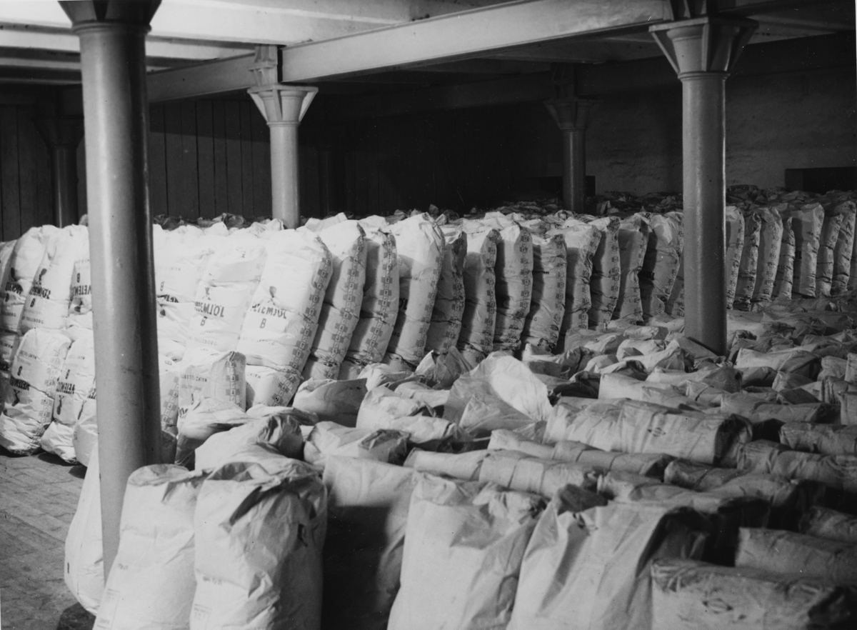 Förråd på bageriet på Stumholmen med uppradade säckar med bland annat mjöl.