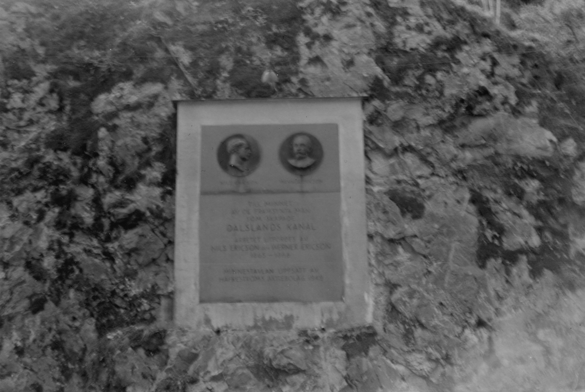 Sten med plata vid Dalslands kanal som avbildar Nils och Werner Ericson. Text på plakat: Till minnet av de framsynta män som skapade Dalslands kanal. Artbetet utfördes av Nils Ericson och Werner Ericson 1865-1868. Minnestavlan uppsat av Håfreströms aktiebolad 1949.