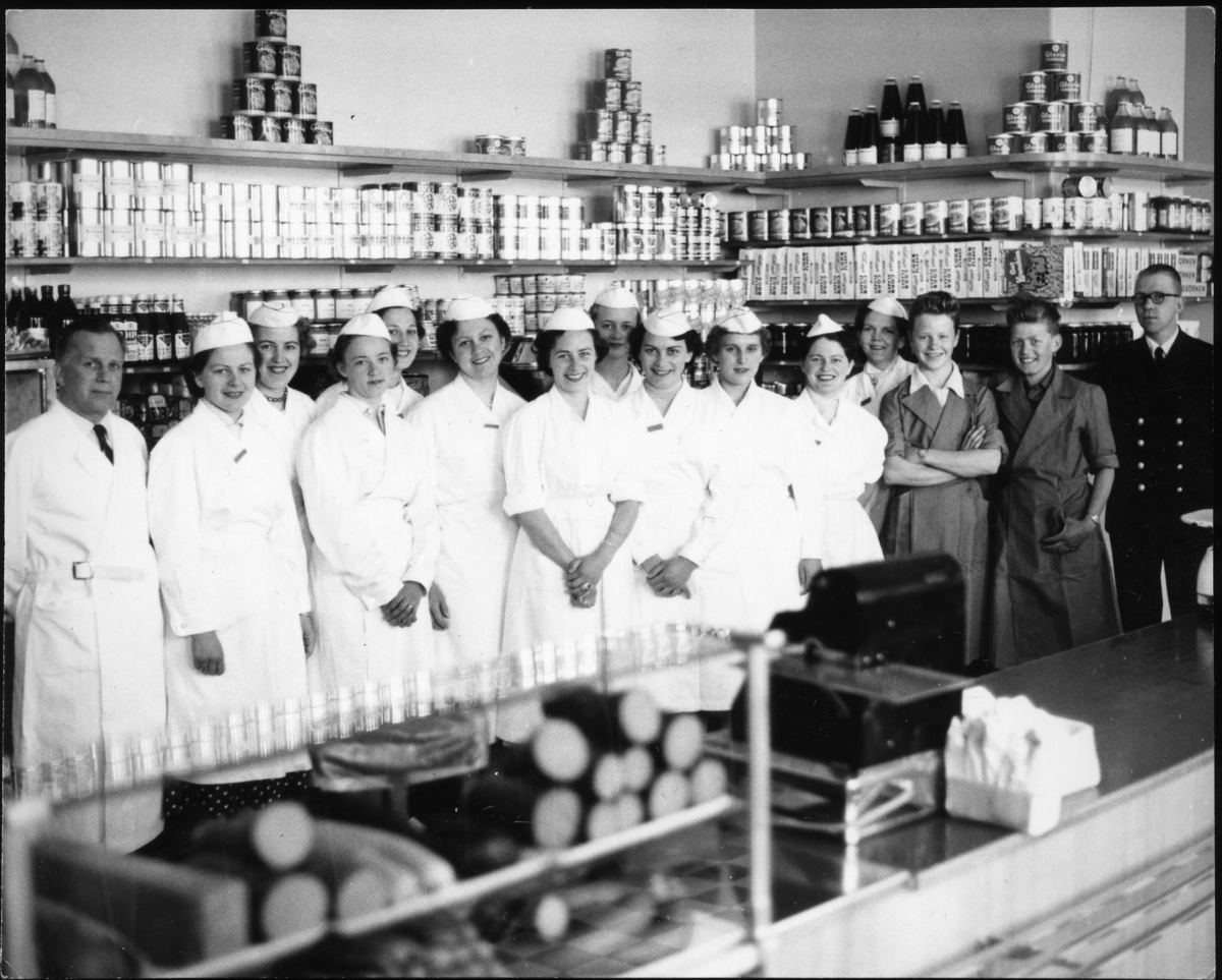 Titel: Personal uppställda bakom charkuteridisken i proviantboden.