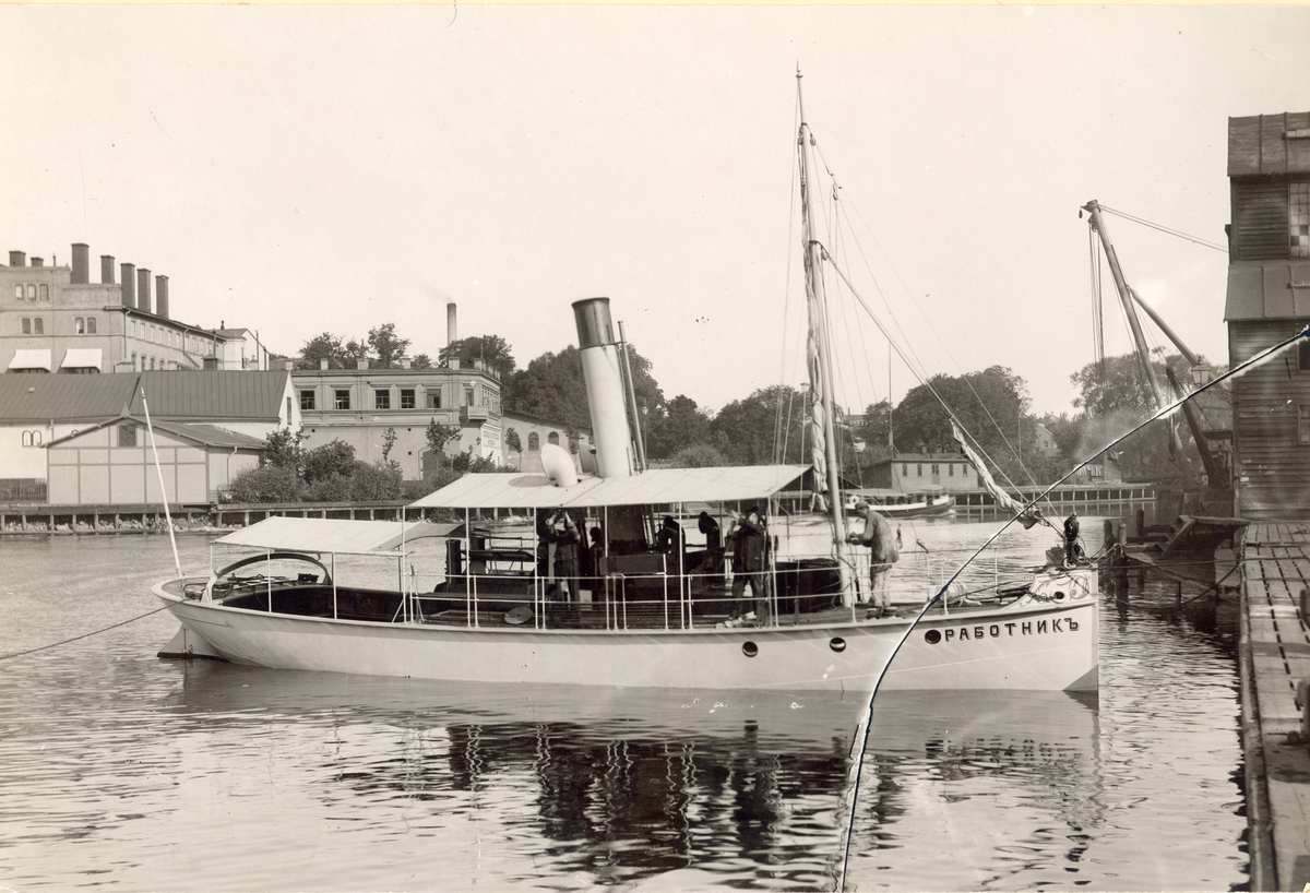 Bogserfartyget RABOTNIK av Astrachan ligger förstöjd vid hamn. Ombord syns bestättning ombord. Fartyget byggdes 1894 på Bergsunds Mekaniska Verkstad.