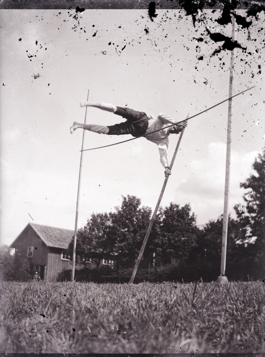 Titel: Nårunga. Olympiad 1912 - Gottfrid hoppar stav på åkern på andra sidan Grevakvarn.