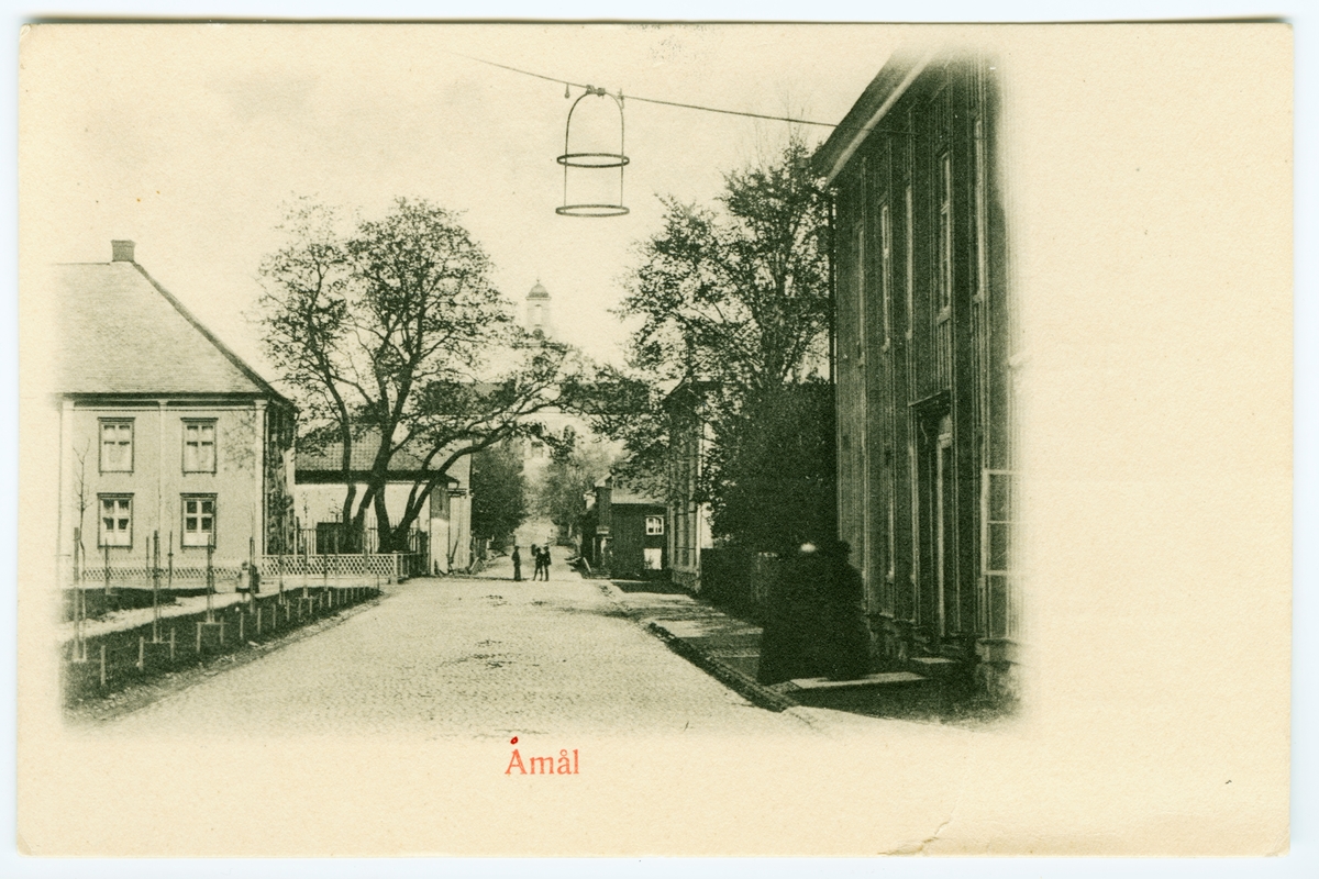 Åmål. Kyrkogatan från söder med Vågmästargården till vänster och Lilliestiernska gården till höger i förgrunden