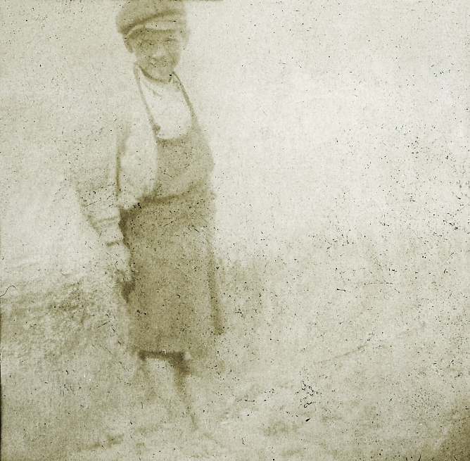 En barfota "trädgårdspojke" i skärmmössa och förkläde har stannat upp för fotografen.