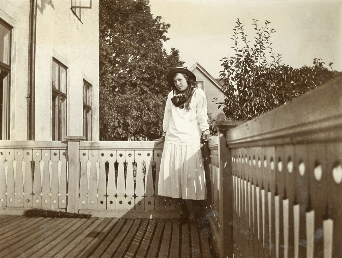 En tonårsflicka i ljus sjömansklänning och hatt poserar på en balkong, trol. på baksidan av fastigheten Bore 3, Kungsgatan, Växjö.