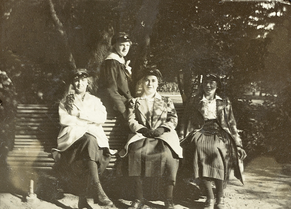 Fyra tonårsflickor i halvlånga kappor, kjol och skolmössa har samlats vid en parksoffa, möjl. i Strandbjörket, Växjö.