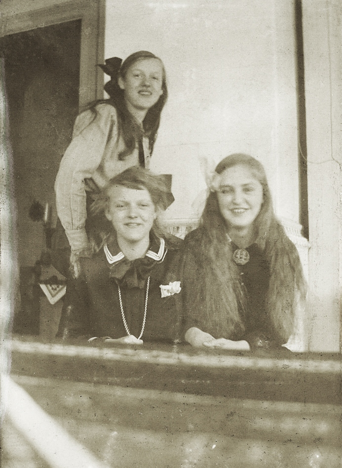 Tre glada tonårsflickor har samlats framför en kakelugn.