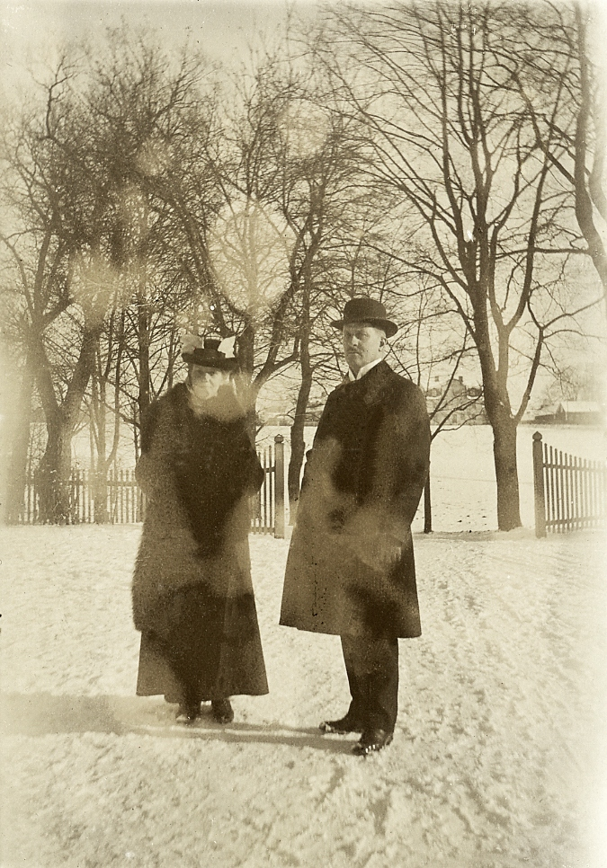 Ett medelålders par på vintrig promenad. I bakgrunden syns ett av husen längs Risingevägen, i närheten av Östrabo.