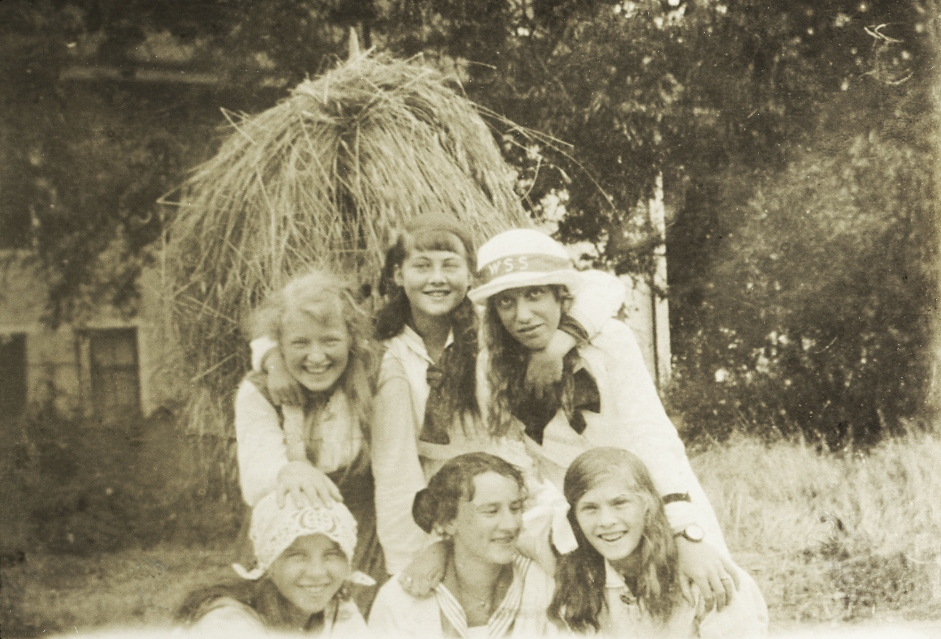 Sex st. glada tonårsflickor i ljusa kläder med sjömanskrage har samlats för fotografen, någostans i Växjö.