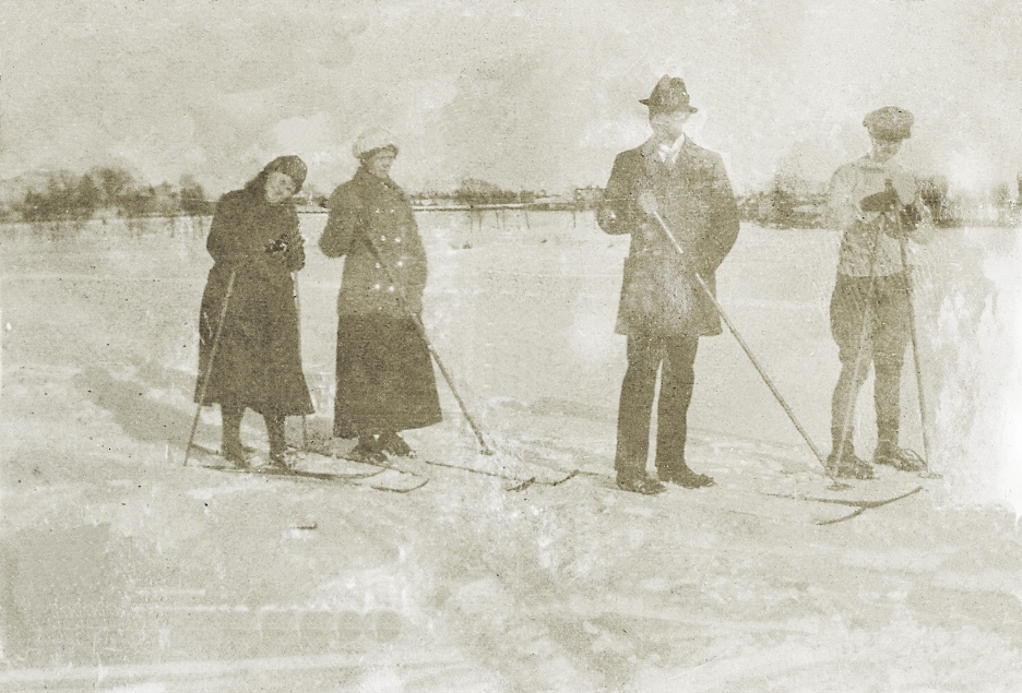 En familj (?) på skidor, trol. på Växjösjöns is.