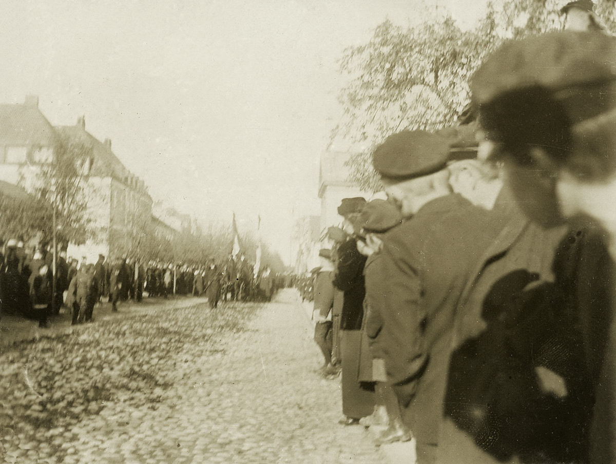 Biskop N.J.O.H. Lindströms begravning i oktober 1916. Begravningståget rör sig längs Linnégatan. Mycket folk har samlats.