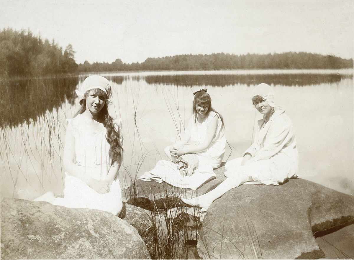 Tre tonårsflickor i badkappa, linne m.m., solar sig på några stenar vid en sjökant.