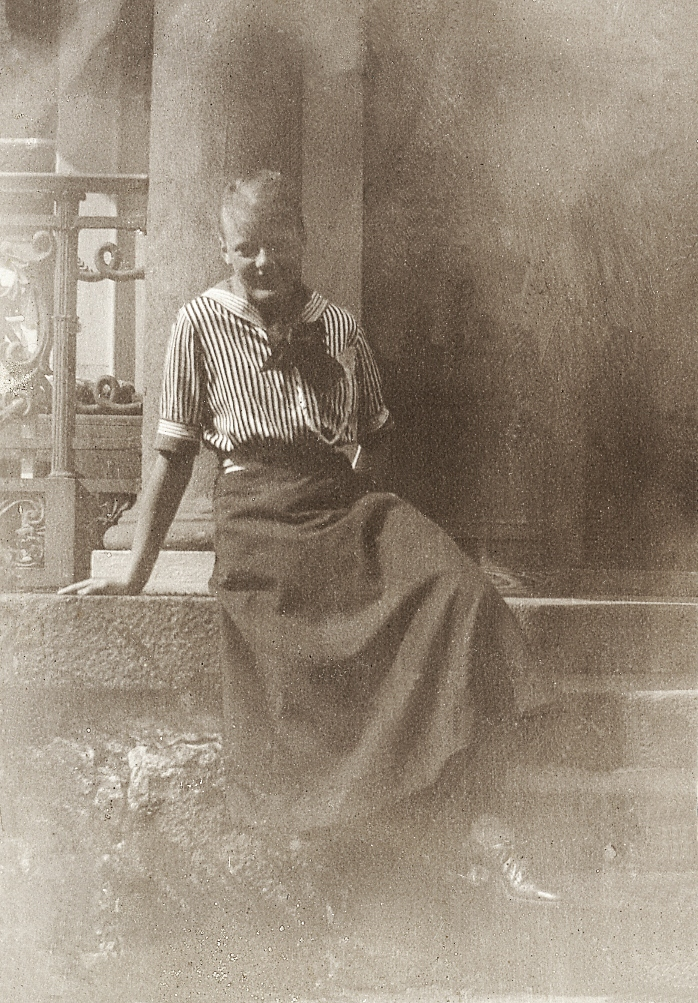 En ung kvinna i randig sjömansblus och mörk kjol sitter på trappan till ett bostadshus.